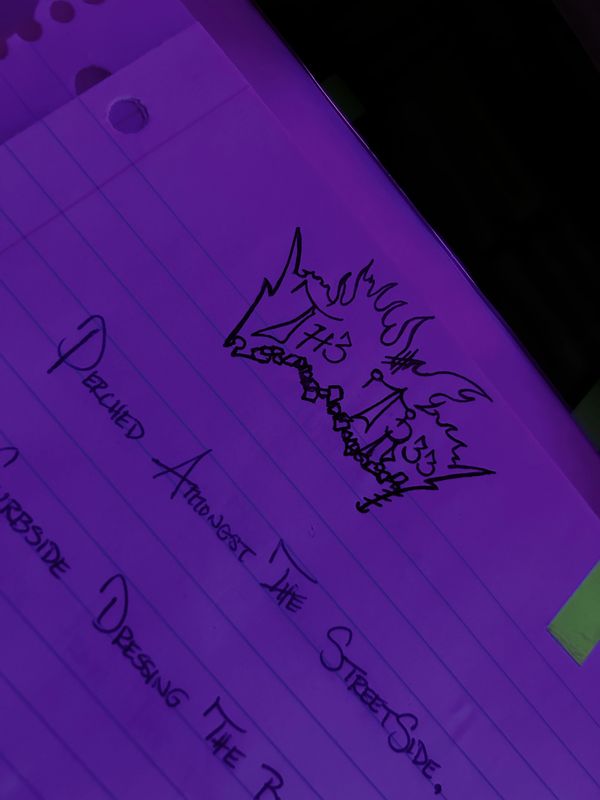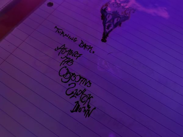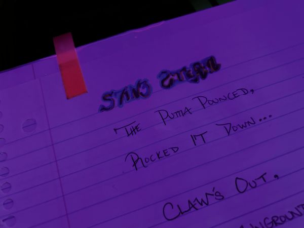 Paper with a wolf-shaped cutout and handwritten text under red lighting.