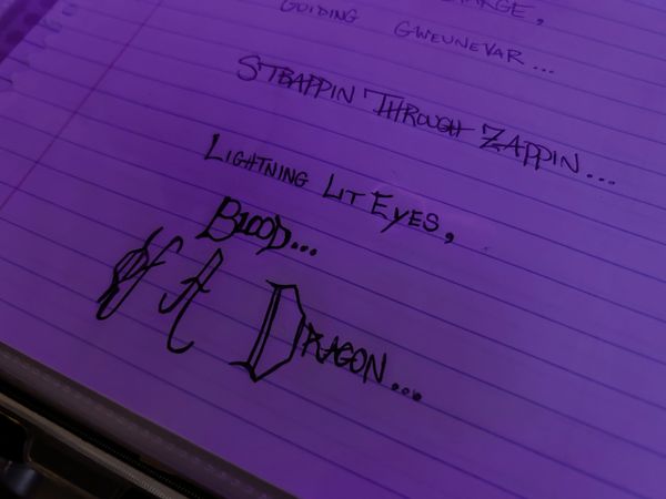 Handwritten phrases "Dancing with the Dragon" repeated on lined paper with red lighting.