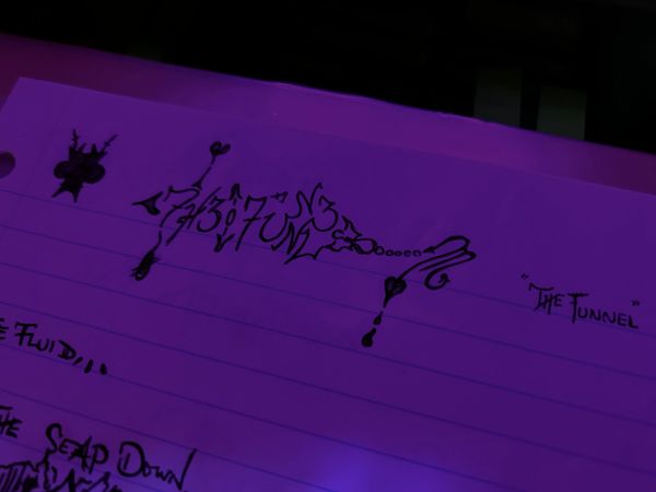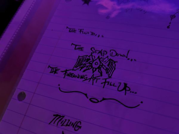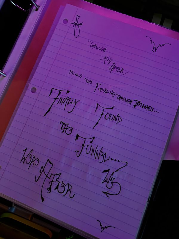 Colorful graffiti-style text and symbols on lined paper in a binder.