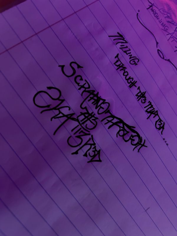 Artistic graffiti-style lettering on lined notebook paper in a binder.